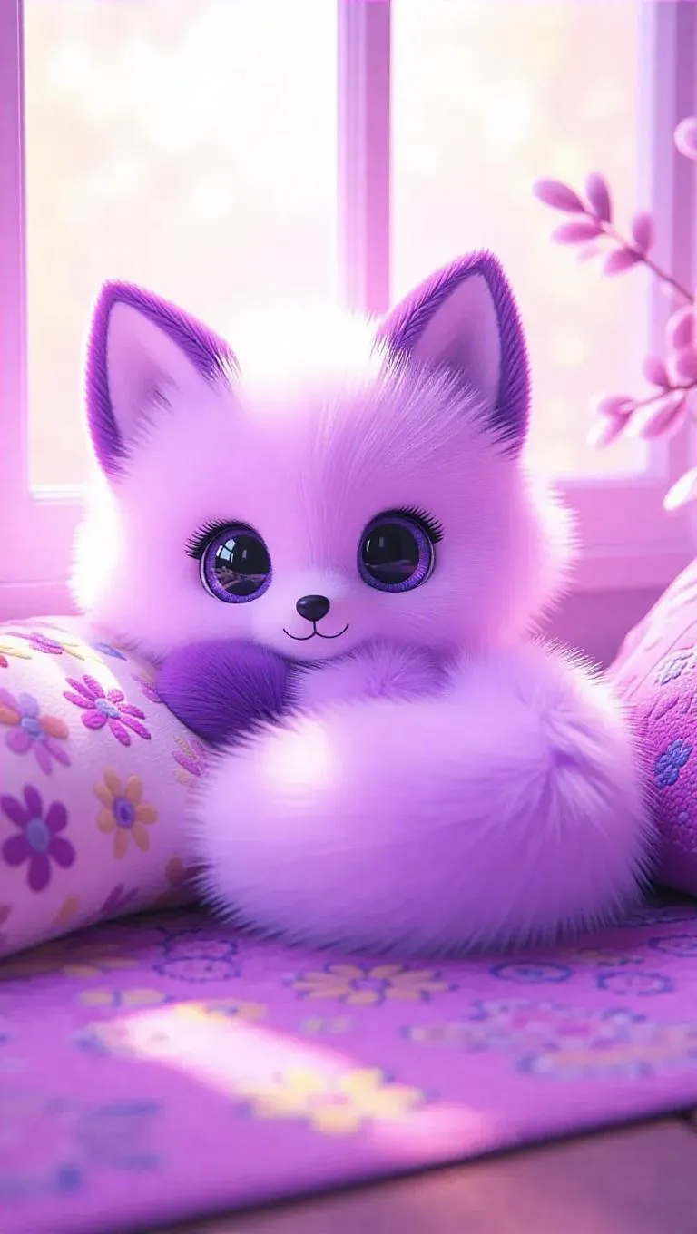 A fluffy, Jellycat-style fox with soft, pastel lavender fur and big, expressive eyes. The fox is curled up in a ball, tail wrapped around, in a cozy, brightly-lit room. Plush toys are scattered in playful arrangements, and a whimsical rug adds magic to the scene. Soft, beaming light filter through the windowpane, casting gentle shadows and highlighting the fox’s fluffy fur. The scene is enchanting and inviting, perfect for a children’s book illustration.