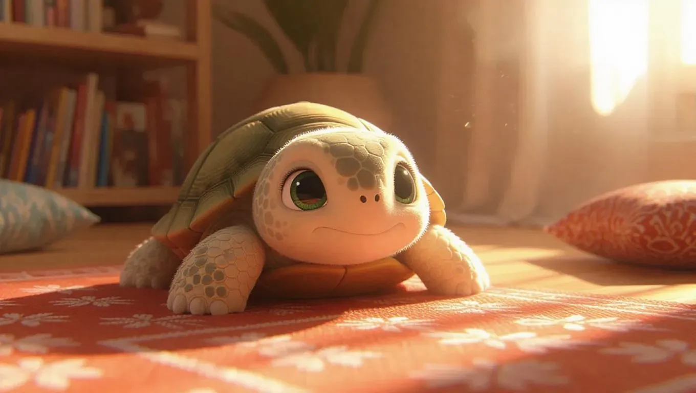 A fluffy, Jellycat-style turtle with soft, pastel cream fur and big, expressive eyes. The turtle is slowly peeking out of its shell, in a cozy, afternoon-lit room. Plush toys are sprawled near a corner, and a coral-patterned rug adds warmth to the scene. Soft, mellow light filters through the opening, casting gentle shadows and showcasing the turtle’s fluffy texture. The scene is tranquil and inviting, perfect for a children’s book illustration.