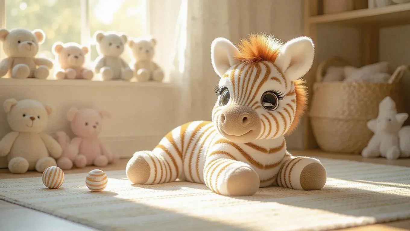 A fluffy, Jellycat-style zebra with soft, pastel gold fur and big, expressive eyes. The zebra is lying down, head raised, in a cozy, lightly-shaded room. Plush toys are scattered in a random order, and a striped rug adds a whimsical touch to the scene. Soft, filtered light flows through the window, casting playful shadows and emphasizing the zebra’s fluffy stripes. The scene is joyous and inviting, suitable for a children’s book illustration.