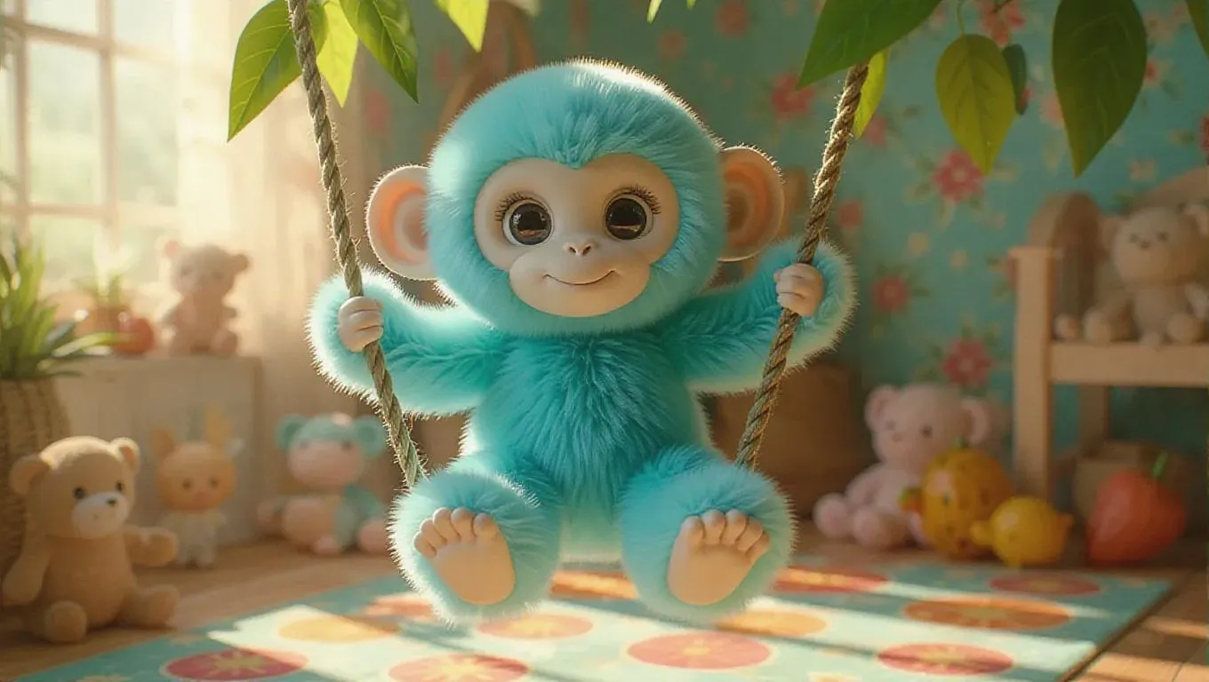 A fluffy, Jellycat-style monkey with soft, pastel teal fur and big, expressive eyes. The monkey is swinging from a vine, looking joyful, in a cozy, sun-drenched room. Plush toys are placed funnily on the floor, and a fruity patterned rug adds a vibrant touch to the scene. Soft, golden sunlight filters through the window, casting zany shadows and accentuating the monkey’s fluffy form. The scene is cheerful and inviting, perfect for a children’s book illustration.