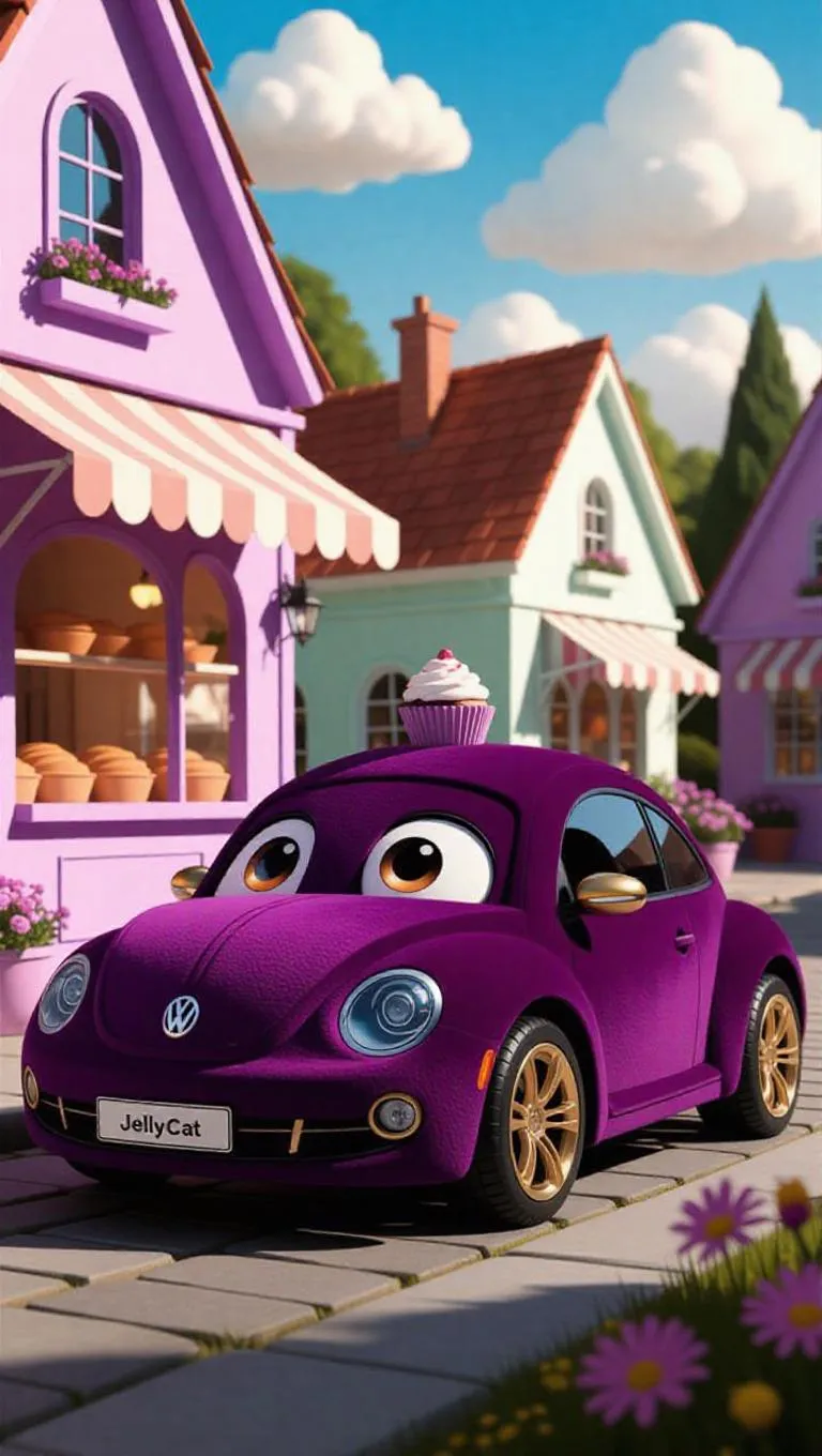 A sleek, Jellycat-style luxury car with soft, rounded edges and large, expressive eyes is parked outside a quaint bakery in a cozy, pastel-colored town. Its body is covered in plush, deep purple fur, with gold paws and a tiny, adorable cupcake on top. The clear blue sky above is dotted with fluffy clouds, and soft, warm sunlight filters through, casting gentle shadows and highlighting the car's cuddly texture. The scene exudes a playful, whimsical charm, perfect for a children's storybook.