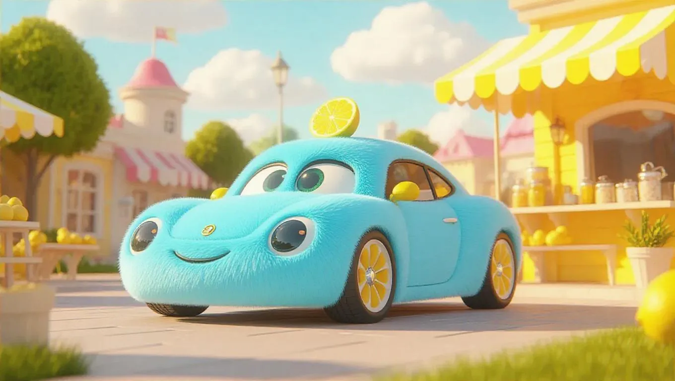 A sleek, Jellycat-style luxury car with soft, rounded edges and large, expressive eyes is parked outside a cheerful lemonade stand in a sunny, pastel-colored town. Its body is covered in plush, baby blue fur, with yellow paws and a tiny, refreshing lemon slice on top. The bright sky above is filled with fluffy clouds, and soft, bright sunlight filters down, creating playful shadows that highlight the car's snuggly texture. The scene radiates a happy, vibrant charm, perfect for a children’s storybook.