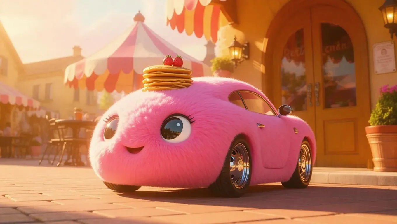 A sleek, Jellycat-style luxury car with soft, rounded edges and large, expressive eyes is parked outside a delightful pancake house in a warm, inviting town. Its body is covered in plush, strawberry pink fur, with matching paws and a tiny, scrumptious pancake on top. The sunny sky above is dotted with fluffy clouds, and gentle rays of sunlight filter down, casting soft shadows and revealing the car's cuddly appearance. The scene offers a whimsical, dazzling charm, perfect for a children's storybook.