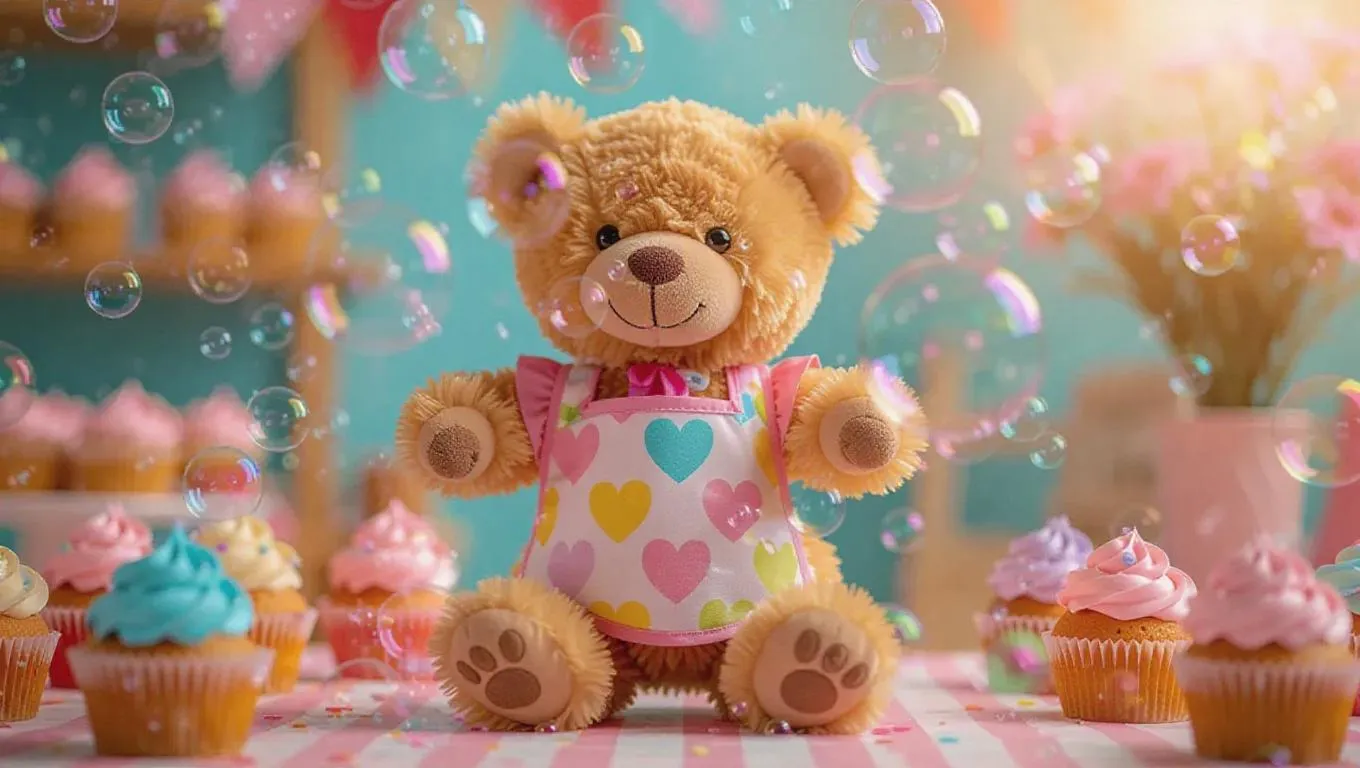 A playful teddy bear wearing a colorful apron, a perfect Valentine’s gift, blows cupcake-shaped bubbles, each filled with sweetness and joy. Delicious desserts float in the background, adding a fun and delicious touch to the scene, enhancing the atmosphere of celebration and happiness.