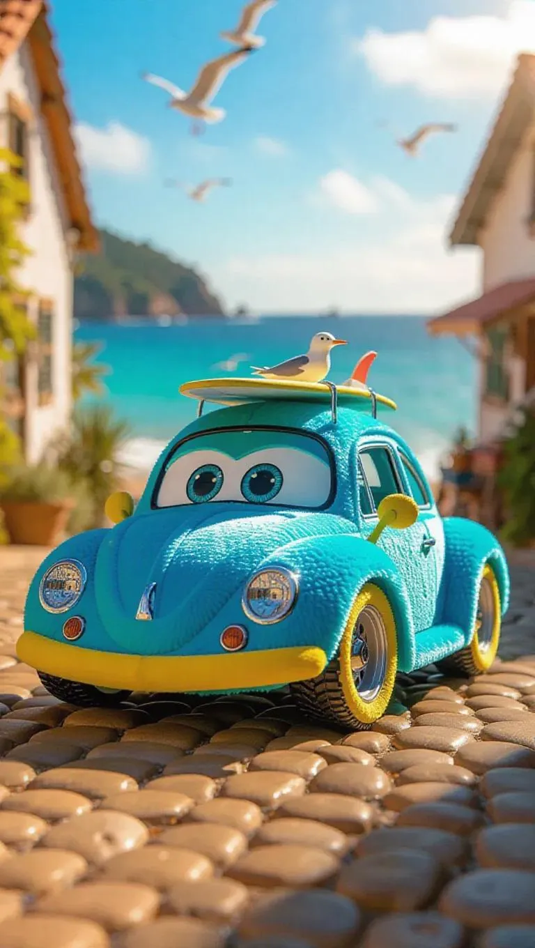 A delightful, Jellycat-inspired sports car with soft curves and large, adorable eyes meanders through a quaint, seaside village. Its body is clad in plush, metallic turquoise fur, with yellow paws and a small, quirky surfboard attached to the roof. The clear ocean blue sky stretches overhead with seagulls soaring, while gentle sunlight dances on the water, accentuating the car's endearing fluffiness.