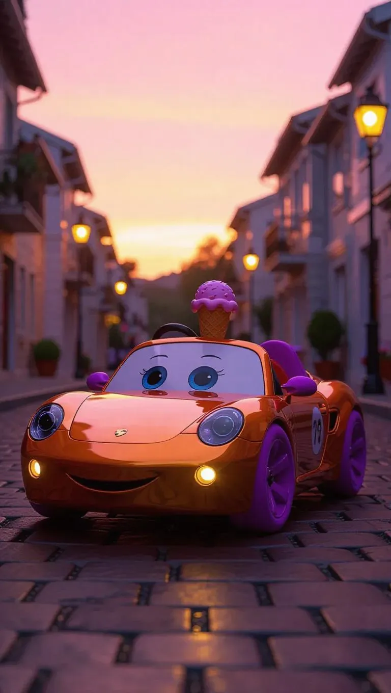 An adorable, Jellycat-themed sports car with smooth, rounded lines and bright, expressive eyes rolls gently through a charming, vintage-inspired street. Its plush, metallic orange fur gleams in the light, boasting purple paws and a tiny, playful ice cream cone on top. The pastel pink sky at dawn casts soft shadows, creating a dreamy ambiance that highlights the car's playful design.