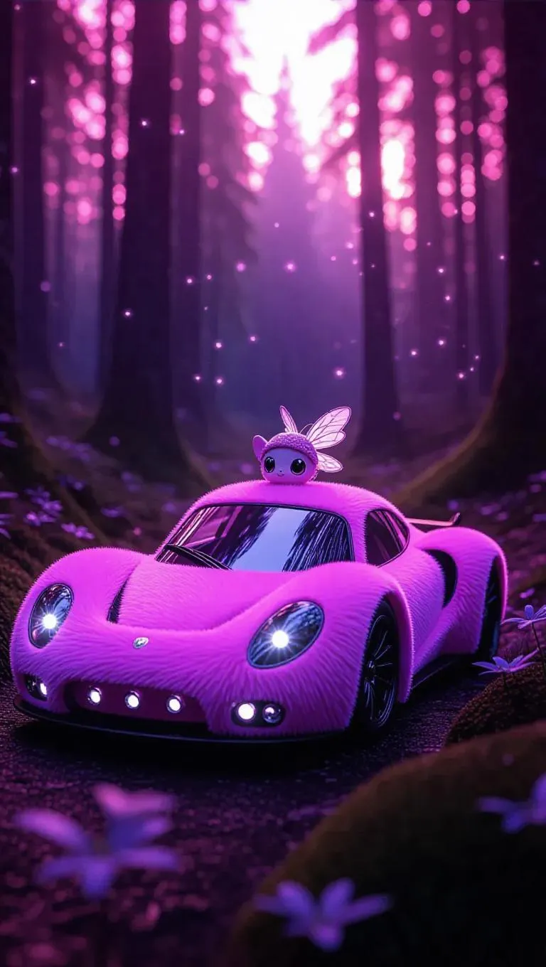 A sleek, Jellycat-inspired sports car with smooth, rounded edges and large, sparkling eyes glides through a magical, fairy-tale forest. Its body is adorned in plush, shimmering pink fur, featuring silver paws and a tiny, enchanting fairy hat on top. The twilight sky is filled with twinkling stars, casting a soft glow that enhances the car's inviting texture in the serene environment.
