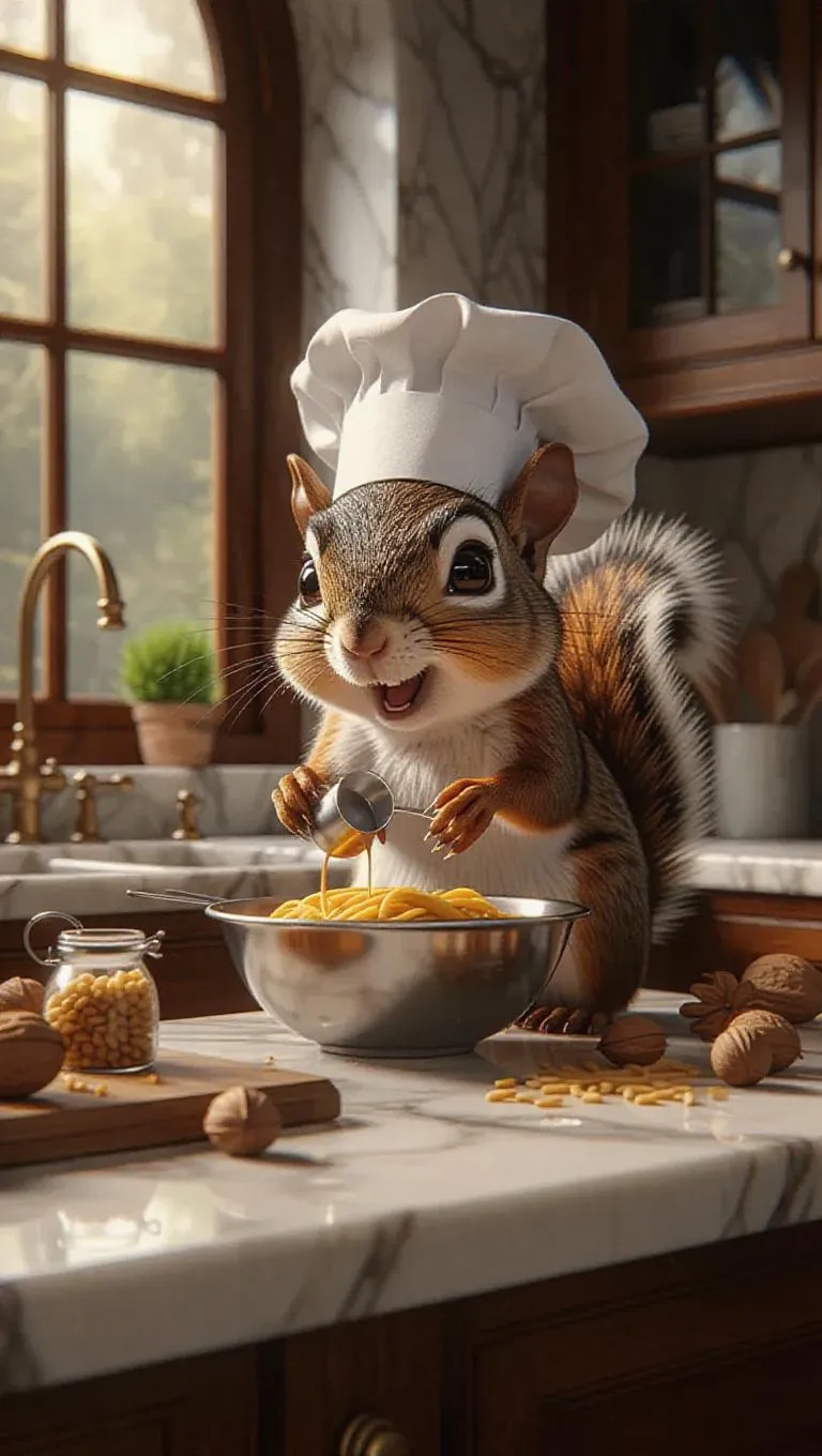 A curious cartoon squirrel wearing a tiny chef's hat, pouring ingredients into a large bowl on an elegant kitchen counter. The squirrel is surrounded by nuts, pasta, and a small measuring cup. The kitchen is upscale and bright, with marble countertops and a large window looking onto a serene garden. The squirrel looks excited and a bit messy, with sauce on its face. The counter is immaculate and stylish.