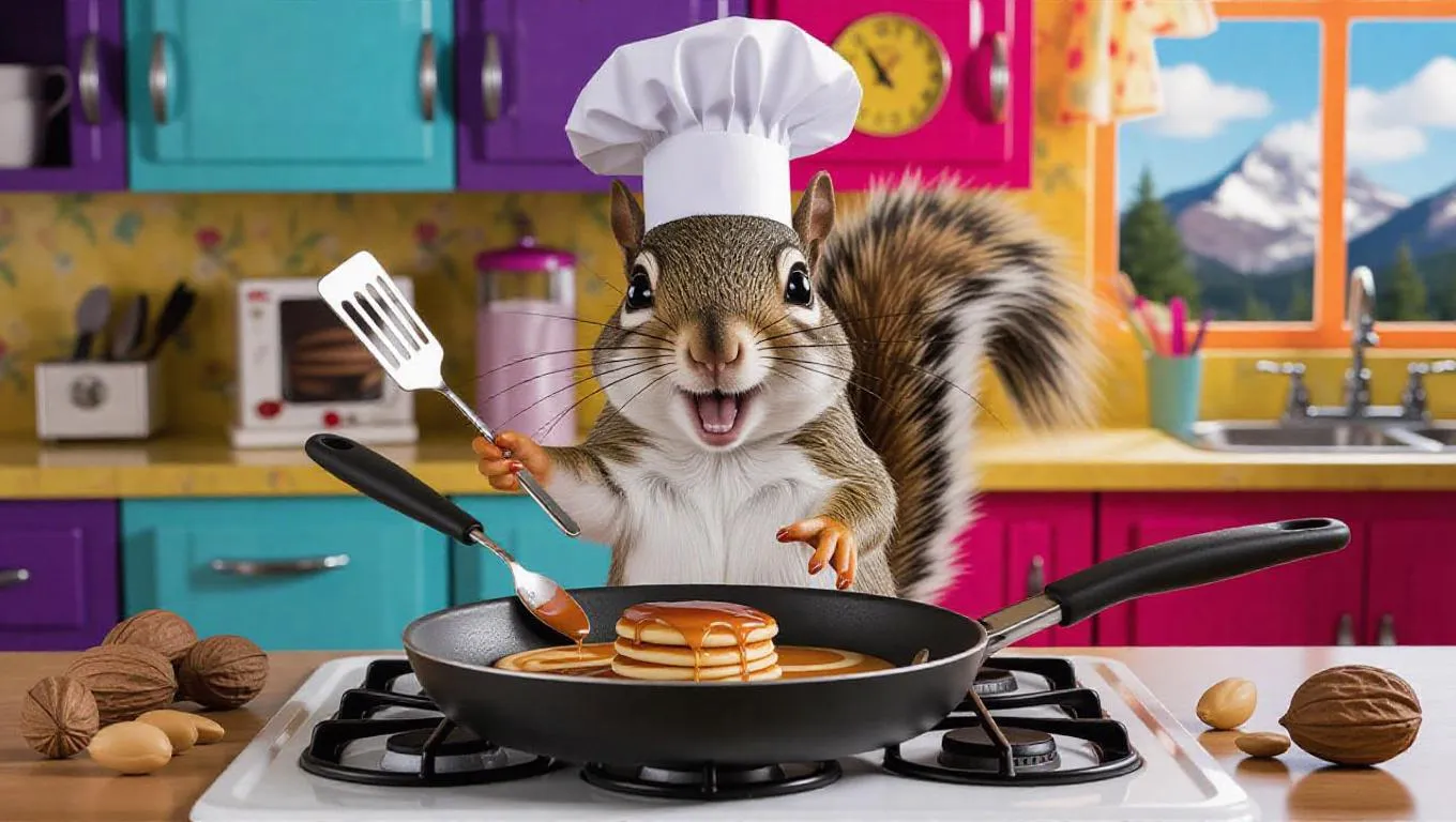 A curious cartoon squirrel wearing a tiny chef's hat, flipping pancakes in a frying pan on a kitchen stove. The squirrel is surrounded by nuts, syrup, and a small spatula. The kitchen is vibrant and colorful, with retro appliances and a large window showcasing a mountain view. The squirrel looks excited and a bit messy, with batter on its face. The stove is clean and organized.