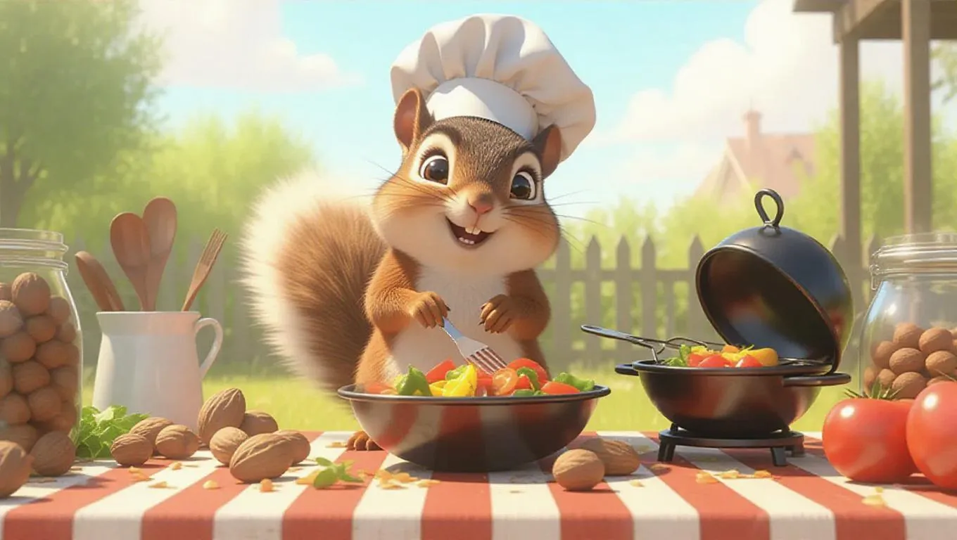 A curious cartoon squirrel wearing a tiny chef's hat, grilling veggies in a bowl on a backyard picnic table. The squirrel is surrounded by nuts, spices, and a small grill. The kitchen is outdoor-themed, with bright garden decor and a large open sky. The squirrel looks happy and a bit messy, with sauce on its face. The table is set for an outdoor feast.