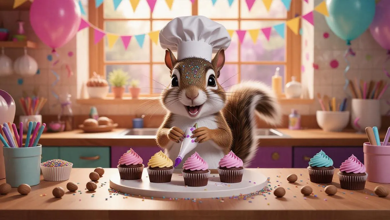A curious cartoon squirrel wearing a tiny chef's hat, decorating cupcakes on a large kitchen counter. The squirrel is surrounded by sprinkles, nuts, and a small piping bag. The kitchen is festive and colorful, with balloons and streamers and a large window showing a celebration outside. The squirrel looks thrilled and a bit messy, with icing on its face. The counter is vibrant with baking supplies.