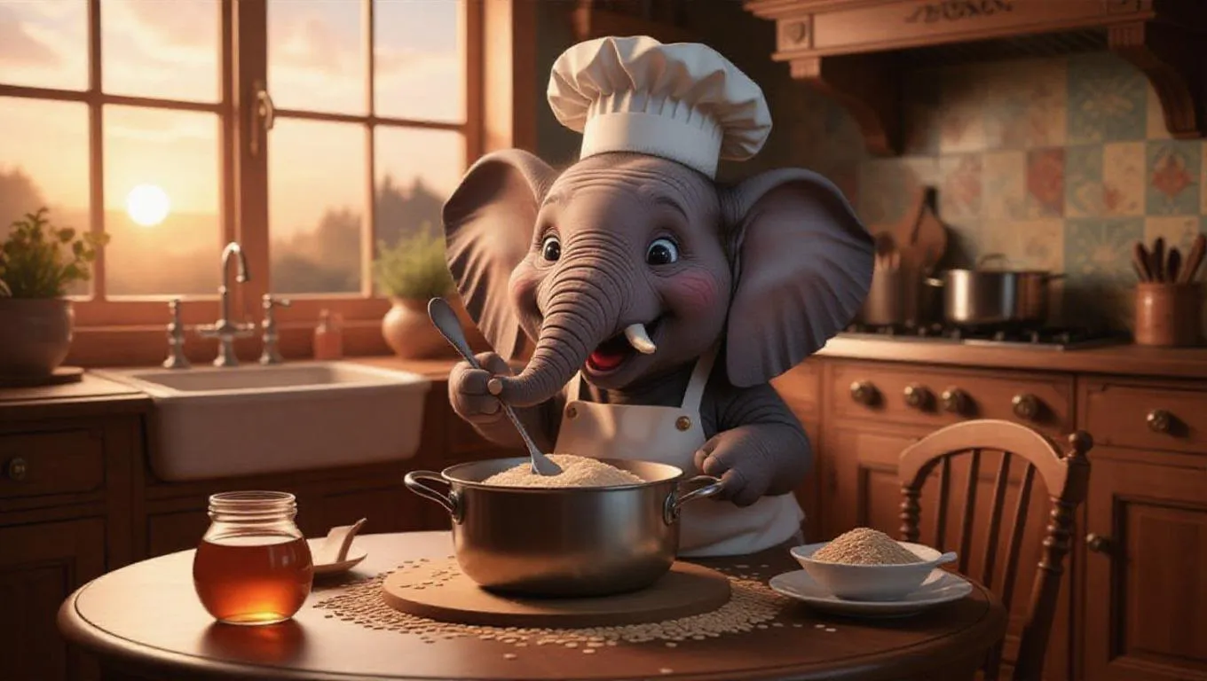 A curious cartoon elephant wearing a tiny chef's hat, stirring a pot of porridge on a wooden kitchen table. The elephant is surrounded by oats, honey, and a small spoon. The kitchen is charming with vintage decor and a large window presenting a warm sunrise. The elephant looks joyful and a bit messy, with porridge on its face. The table is set for a hearty breakfast.