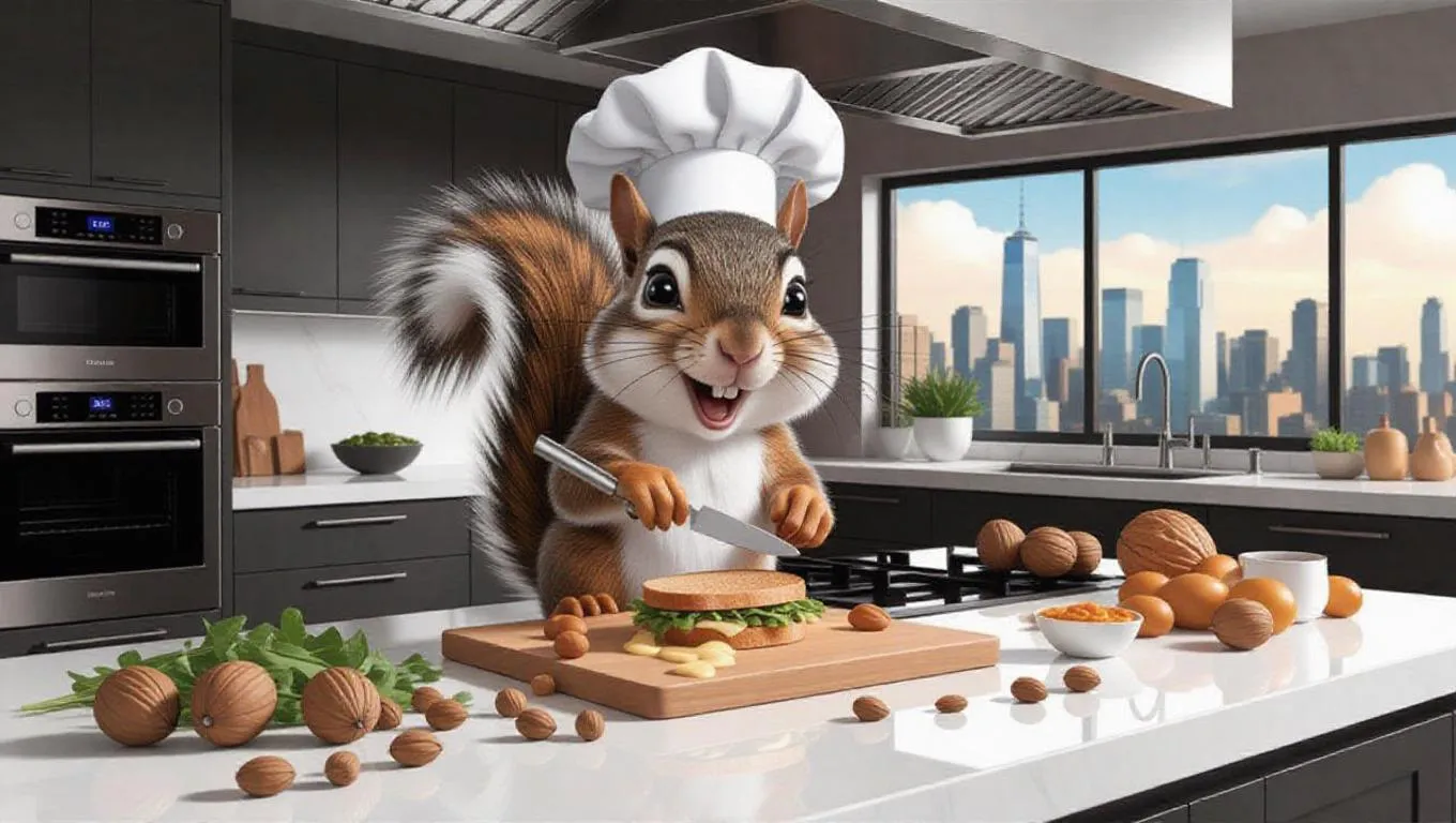 A curious cartoon squirrel wearing a tiny chef's hat, assembling a sandwich on a large kitchen island. The squirrel is surrounded by nuts, greens, and a small knife. The kitchen is sleek and modern, with high-end appliances and a large window overlooking a city skyline. The squirrel looks enthusiastic and a bit messy, with mayonnaise on its face. The island is neatly arranged.