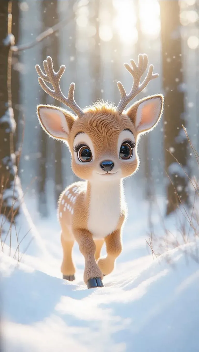 A fluffy, Jellycat-style little deer walks cautiously through a snowy forest clearing. Its large, expressive eyes are wide with curiosity, and its soft, pastel yellow fur glistens in the soft, winter sunlight. The deer's delicate antlers are just beginning to sprout, adding to its endearing charm. The forest around it is bathed in a cool, silvery light, creating a magical and serene atmosphere. The scene is rendered in a soft, pastel color palette, enhancing the overall cuteness and innocence of the deer.