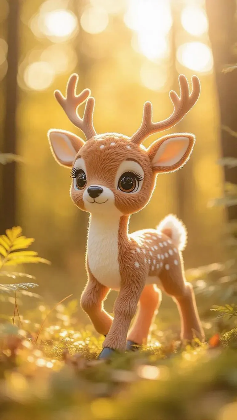 A fluffy, Jellycat-style little deer walks playfully through a sunny forest clearing. Its large, expressive eyes are playful with joy, and its soft, pastel brown fur glistens in the bright, summer sunlight. The deer's delicate antlers are fully grown, adding to its majestic charm. The forest around it is bathed in a warm, golden light, creating a cheerful and vibrant atmosphere. The scene is rendered in a warm, vibrant color palette, enhancing the overall beauty and grace of the deer.