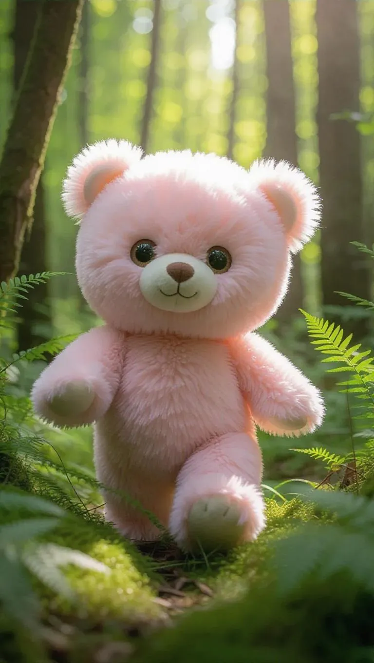 A fluffy, Jellycat-style little bear wanders cautiously through a dense forest clearing. Its large, expressive eyes are wide with wonder, and its soft, pastel pink fur glistens in the gentle, spring sunlight. The bear's little paws are outstretched, adding to its innocent appeal. The forest around it is bathed in a soft, green light, creating a peaceful and tranquil atmosphere. The scene is rendered in a soft, green color palette, enhancing the overall sweetness of the bear.