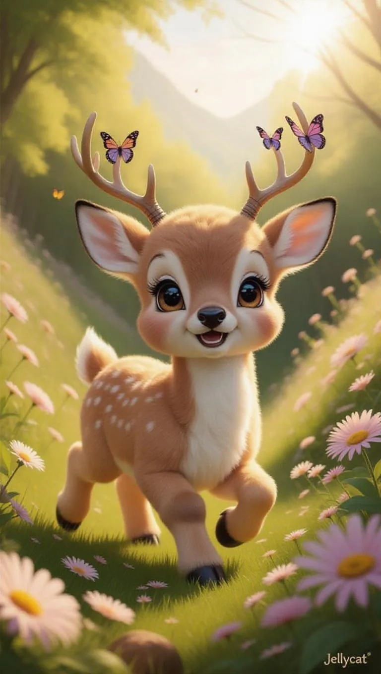 A fluffy, Jellycat-style little deer trots happily through a sun-drenched valley. Its large, expressive eyes are glimmering with joy, and its soft, pastel green fur glistens in the bright, afternoon sunlight. The deer's new antlers are adorned with butterflies, adding to its enchanting charm. The valley around it is bathed in a warm, radiant light, creating a lively and jubilant atmosphere. The scene is rendered in vibrant, lively colors, enhancing the overall enchantment of the deer.
