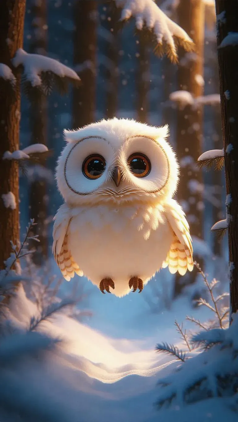 A fluffy, Jellycat-style little owl glides quietly through a snowy forest clearing. Its large, expressive eyes are filled with curiosity, and its soft, pastel cream feathers glisten in the soft, winter sunlight. The owl's wings are slightly spread out, adding to its majestic charm. The forest around it is bathed in a cool, soothing light, creating a magical and serene atmosphere. The scene is rendered in a gentle, muted color palette, enhancing the overall elegance and grace of the owl.