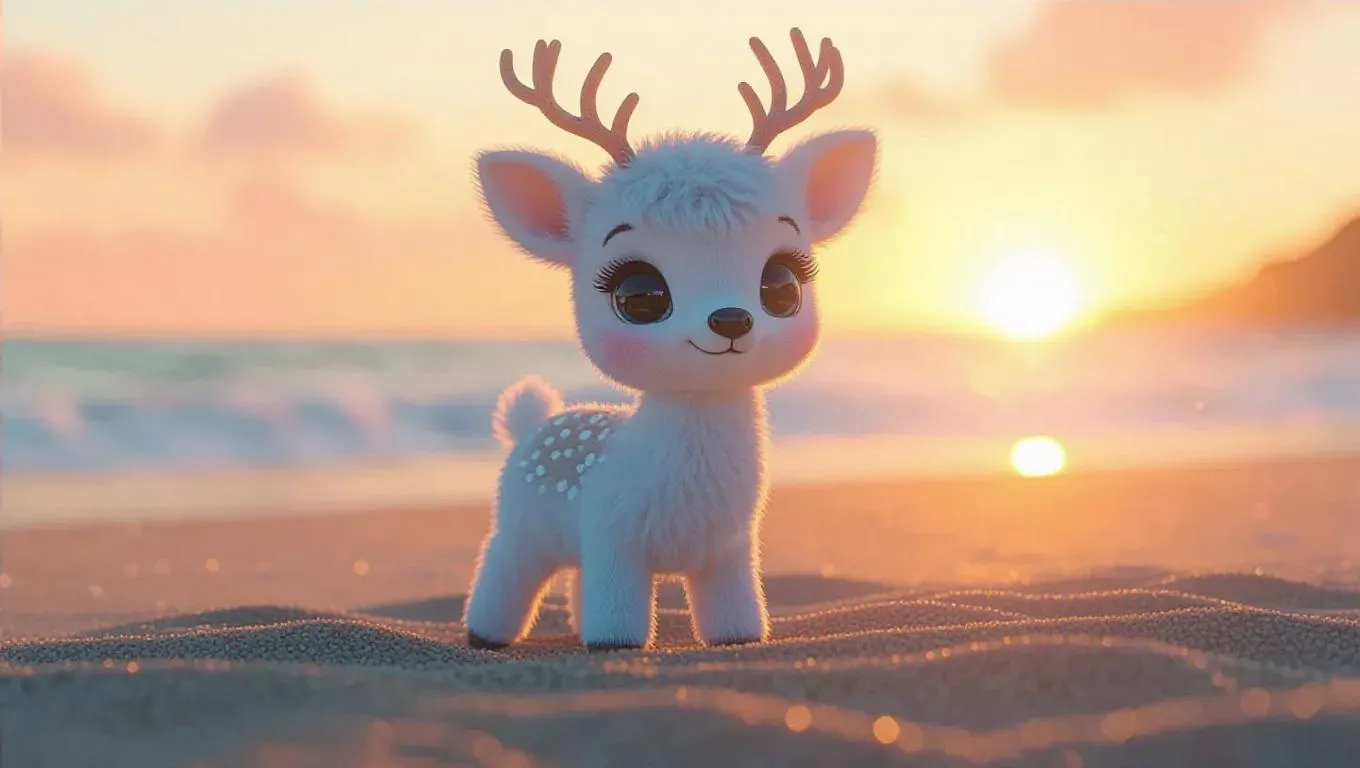 A fluffy, Jellycat-style little deer explores a sandy beach at sunset. Its large, expressive eyes are filled with wonder, and its soft, pastel blue fur glistens in the warm, setting sun. The deer's delicate antlers are silhouetted against the colorful sky, adding to its enchanting beauty. The beach around it is bathed in a soft, orange light, creating a magical and serene atmosphere. The scene is rendered in a vibrant, sunset color palette, enhancing the overall dreaminess of the deer.