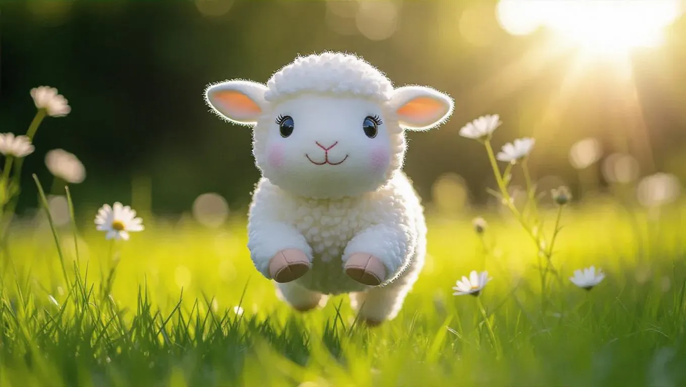 A fluffy, Jellycat-style little lamb leaps playfully through a lush green field. Its large, expressive eyes are sparkling with joy, and its soft, pastel white wool glistens in the bright, welcoming sunlight. The lamb's tiny horns are just sprouting, adding to its adorable charm. The field around it is bathed in a warm, sunshine hue, creating a lively and cheerful atmosphere. The scene is rendered in bright, happy colors, enhancing the overall cuteness of the lamb.