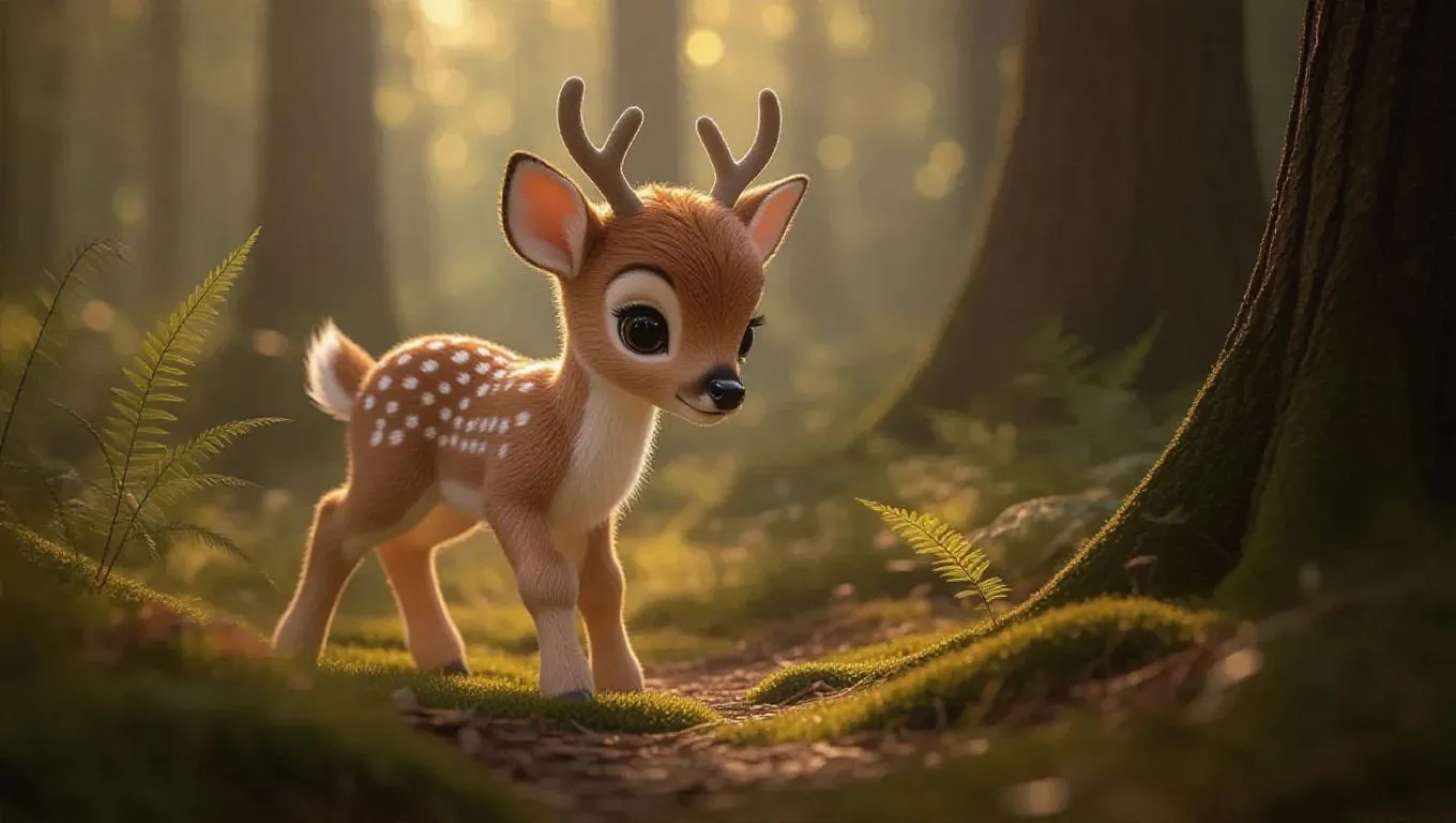 A fluffy, Jellycat-style little fawn cautiously explores a tranquil forest glade. Its large, expressive eyes are wide with awe, and its soft, pastel brown fur glistens in the gentle, filtered sunlight. The fawn's tiny antlers are just beginning to grow, adding to its innocent charm. The glade around it is bathed in a soft, dappled light, creating a peaceful and enchanted atmosphere. The scene is rendered in soft, natural colors, enhancing the overall serenity of the fawn.
