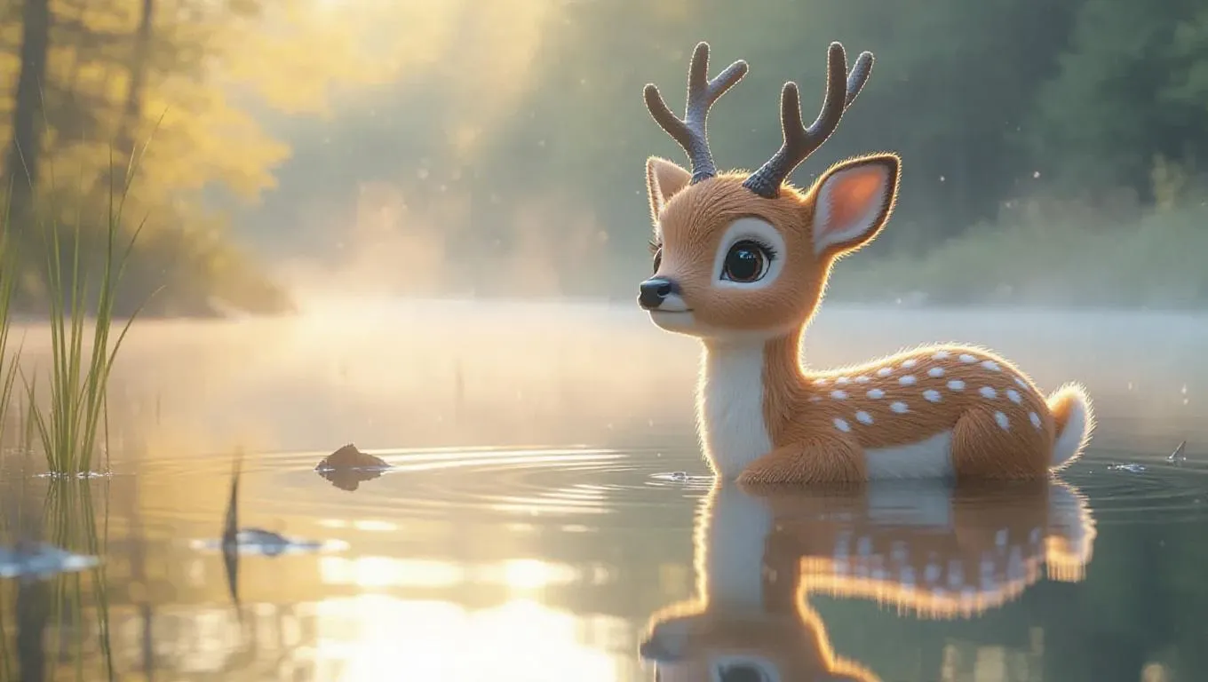 A fluffy, Jellycat-style little deer gazes curiously across a misty lake at dawn. Its large, expressive eyes are filled with wonder, and its soft, pastel yellow fur glistens with dew in the soft, early sunlight. The deer's delicate antlers are glistening with mist, adding to its ethereal charm. The lake around it is shrouded in light fog, creating a calm and magical atmosphere. The scene is rendered in soft, muted colors, enhancing the overall dreaminess of the deer.