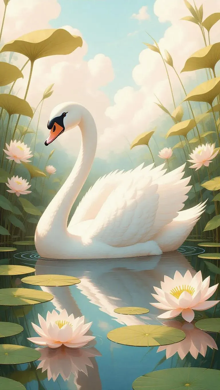 An elegant, oversized swan with bright eyes and a graceful smile, surrounded by delicate puffs of fluff, evoking a serene, romantic atmosphere. The scene is painted in a pastel-themed lake filled with giant water lilies and dreamy, billowy clouds hovering above. The illustration style is reminiscent of classic storybook art, characterized by fluid lines and soft palettes.