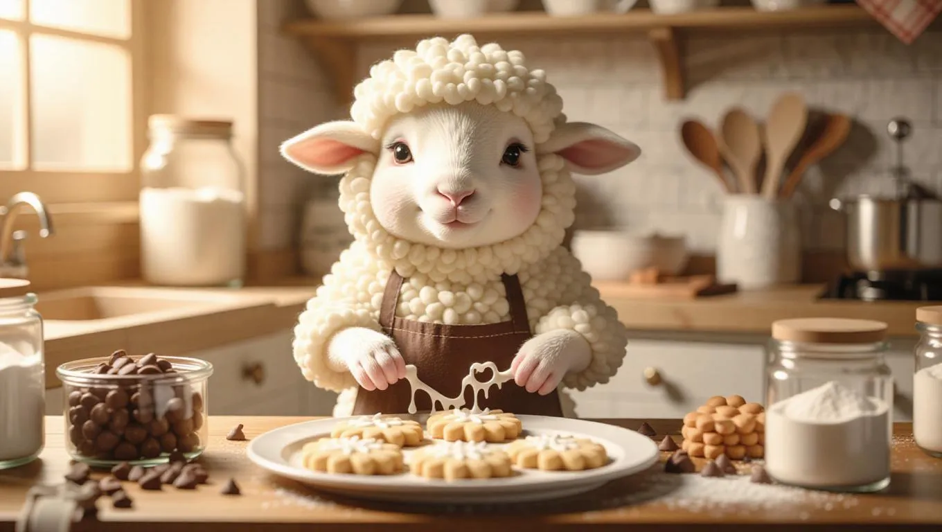 A fluffy sheep is baking cookies in a warm, inviting kitchen. The sheep is wearing a tiny apron and using cookie cutters to shape dough. On the counter, there are ingredients like chocolate chips, flour, and sugar. After finishing the cookies, the sheep sits at a small table with a plate of cookies in front of it, smiling as it drizzles icing on top.