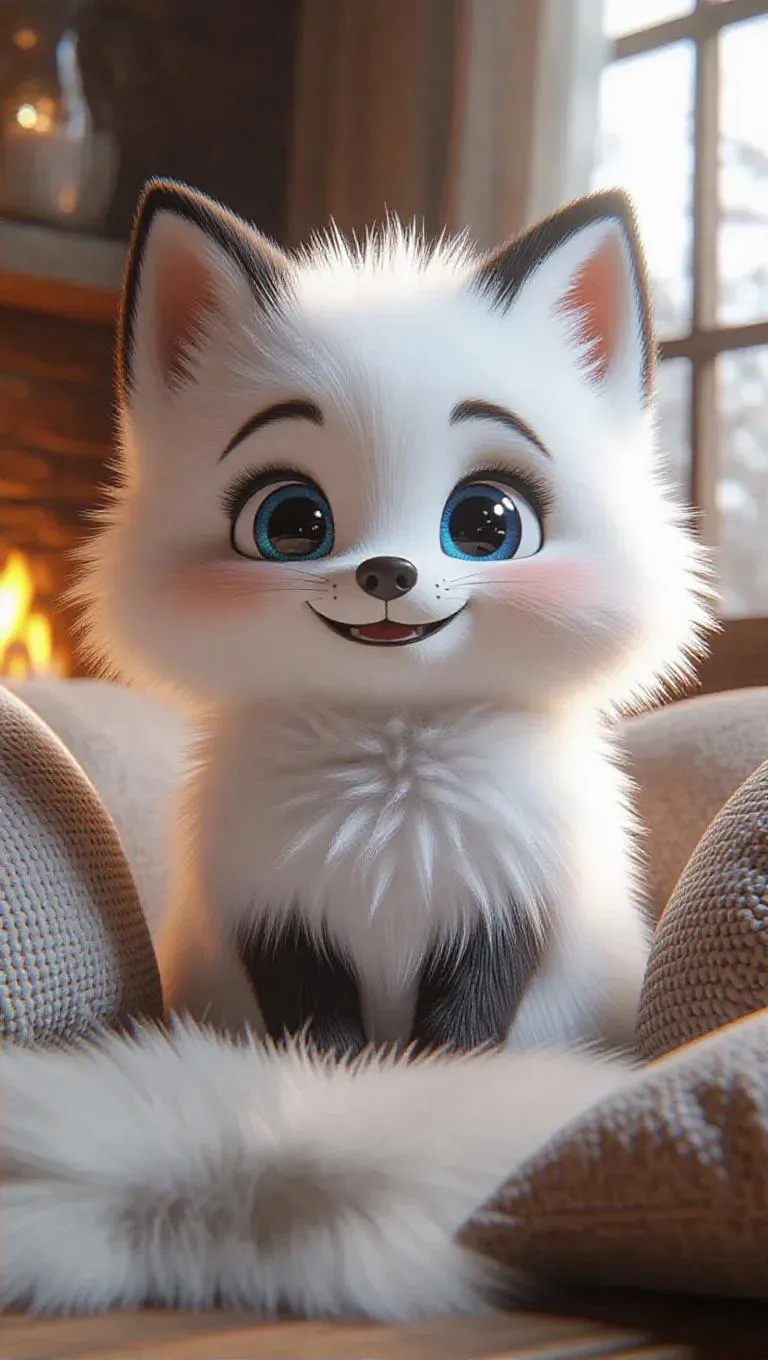 A soft, oversized fox with bright eyes and a cheerful smile, surrounded by a haze of cotton-candy-like fluff, creating an imaginative, dreamy setting. The environment is a cozy, soft living space with oversized cushions and a gentle, crackling fireplace. The artistic style is inspired by digital 3D rendering, featuring smooth surfaces and rich colors.