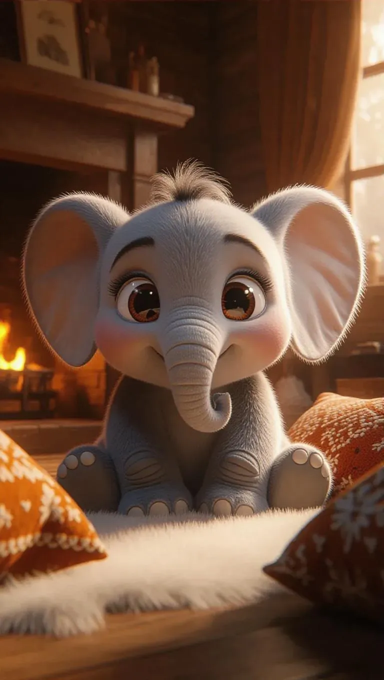 A lovable, oversized elephant with glimmering eyes and a gentle smile, surrounded by a mist of whimsical fluff, lending a surreal, enchanting atmosphere. The setting is a warm, fluffy room, filled with large cushions and a softly crackling fireplace. The aesthetic takes cues from digital 3D rendering, highlighting smooth textures and vibrant hues.