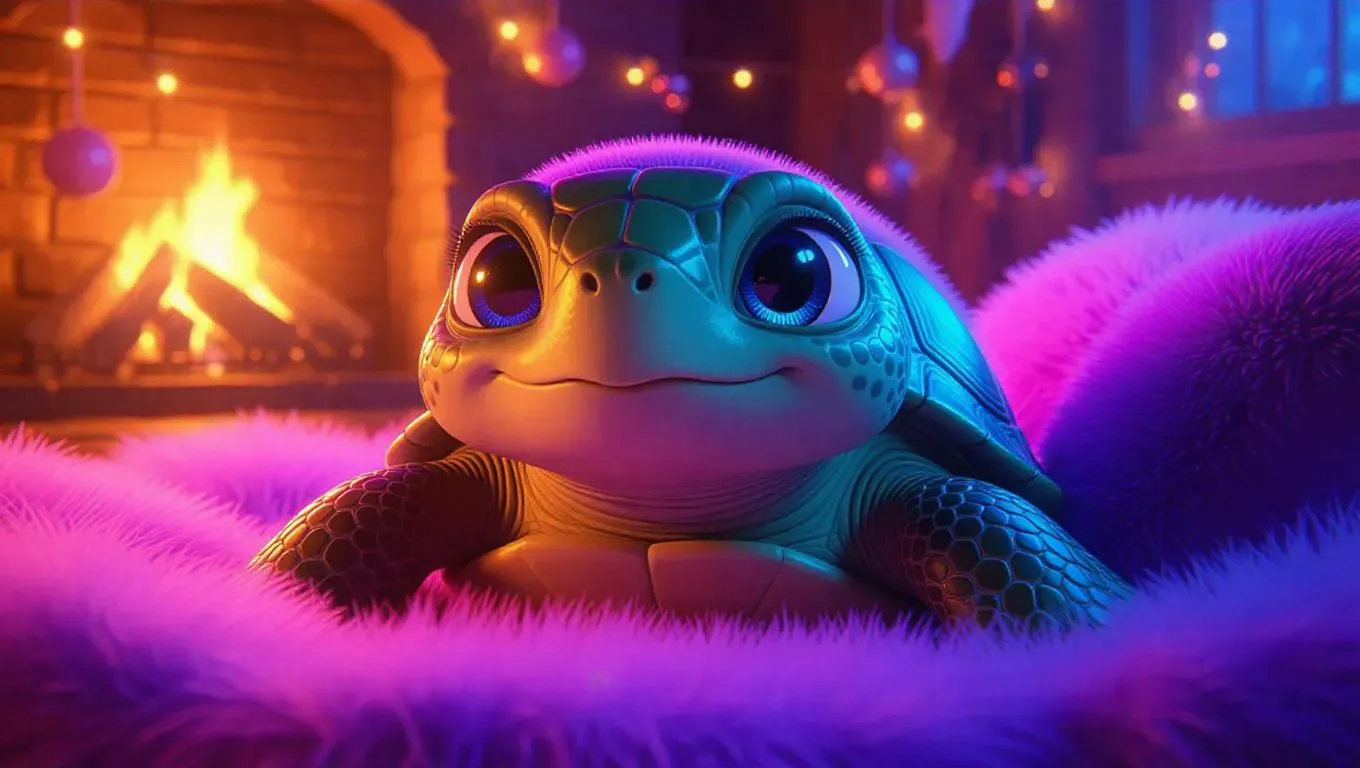 An adorable, oversized turtle with shining eyes and a calm smile, surrounded by a gentle mist of candy-colored fluff, creating a serene, enchanting setting. The scene is set in a cozy, fluffy room with large soft pillows and a warm, crackling fireplace. The design draws from digital 3D art, emphasizing smooth textures and lively hues.