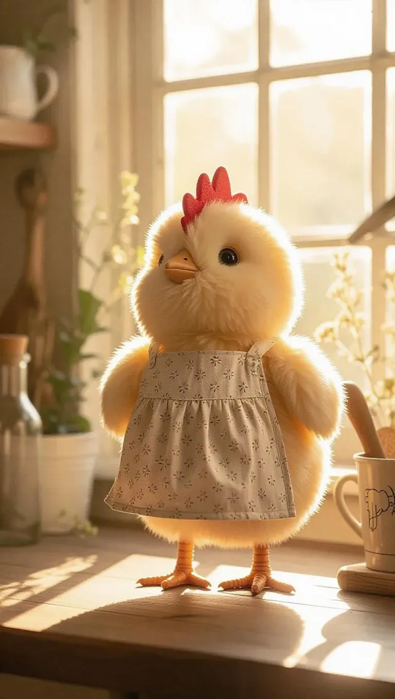 A fluffy, cute hen in a Jellycat style, wearing a delicate apron, stands confidently as it sings. The hen's soft and warm brown feathers, with curious and lively eyes, shine in the cozy country kitchen. Sunlight streams through the window, casting a warm, natural glow that illuminates every corner, creating a serene and harmonious atmosphere. Style: Adorable realism.