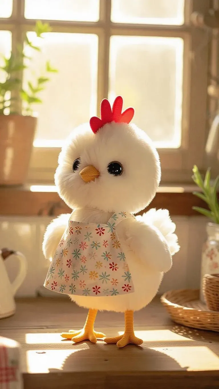 A fluffy, cute hen in a Jellycat style, wearing a delicate apron, stands confidently as it crows. The hen's soft and warm white feathers, with curious and lively eyes, shine in the cozy rustic kitchen. Sunlight streams through the window, casting a warm, natural glow that illuminates every corner, creating a serene and harmonious atmosphere. Style: Adorable realism.