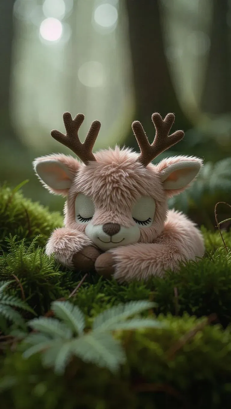 A fluffy, Jellycat-style little stag rests curled up in a soft patch of moss in a misty forest glade. Its large, sparkling eyes are gently closed, and its soft, gray fur glistens in the gentle morning light. The stag's tiny antlers are just beginning to grow, adding to its delightful charm. The glade around it is enveloped in soft, muted light, creating a peaceful and calm atmosphere. The scene is rendered in a gentle, pastel color palette, enhancing the overall cuteness and innocence of the stag.