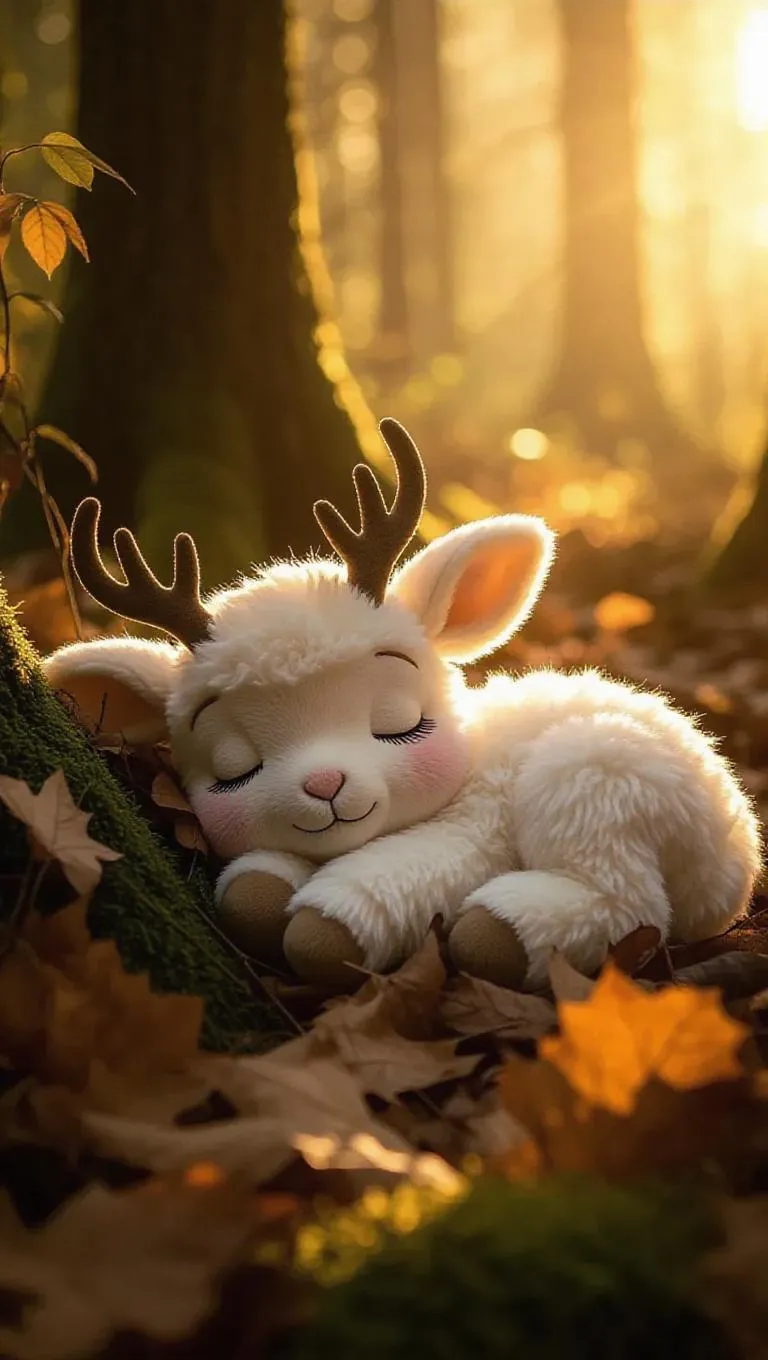 A fluffy, Jellycat-style little doe lies curled up on a soft bed of leaves in a sunlit forest clearing. Its large, drowsy eyes are slowly closing, and its soft, cream-colored fur glistens in the filtered sunlight. The doe's small, budding antlers are starting to show, adding to its charming appeal. The forest surrounding it is illuminated by warm, rosy light, creating a cozy and inviting atmosphere. The scene is portrayed in a soft, warm color palette, enhancing the overall cuteness and innocence of the doe.