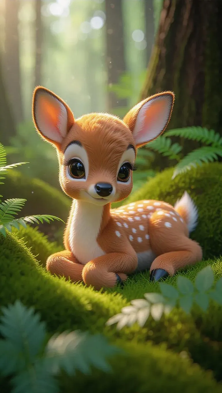 A fluffy, Jellycat-style little deer lies nestled in a soft patch of moss in a vibrant forest clearing. Its large, playful eyes are shining brightly, and its soft, golden fur glistens in the morning sun. The deer's twinkling ears are perked up, adding to its infectious charm. The clearing around it is filled with vibrant green foliage, creating a lively and enchanting atmosphere. The scene is illustrated in a bright, cheerful color palette, enhancing the overall cuteness and innocence of the deer.