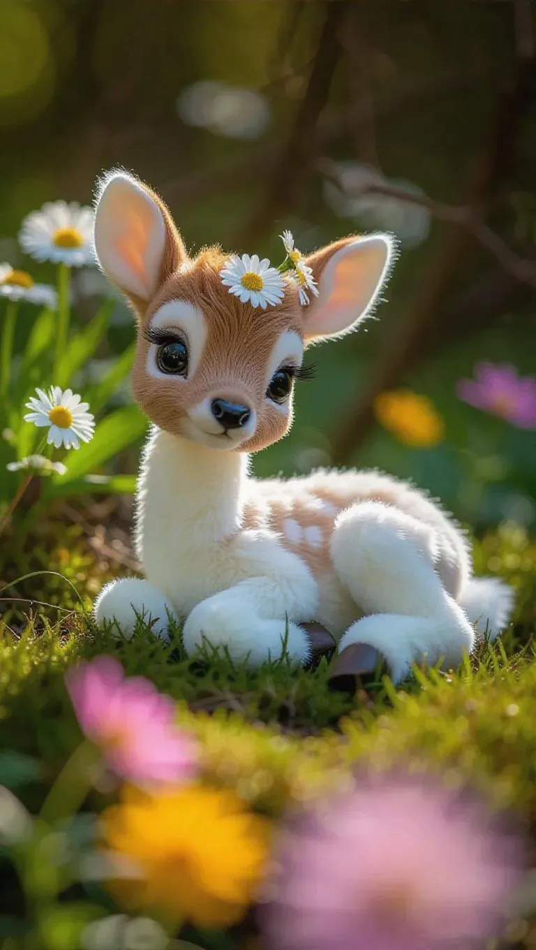 A fluffy, Jellycat-style little deer rests curled up in a soft patch of moss in a colorful spring garden. Its large, attentive eyes are slightly open, and its soft, white fur glistens in the bright sunlight. The deer's delicate muzzle is adorned with tiny flowers, adding to its delightful appearance. The garden surrounding it is in full bloom, creating a cheerful and joyous atmosphere. The scene is rendered in a bright, floral color palette, enhancing the overall cuteness and innocence of the deer.