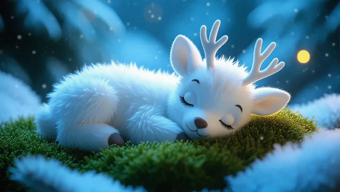 A fluffy, Jellycat-style little stag lies curled up in a soft patch of moss in a winter wonderland. Its large, cozy eyes are gently closed, and its soft, white fur glistens with frost in the shimmering moonlight. The stag's delicate, antler tips are dusted with snow, adding to its enchanting charm. The winter scene around it is illuminated by a soft blue light, creating a tranquil and wintry atmosphere. The scene is presented in a soft, icy color palette, enhancing the overall cuteness and innocence of the stag.