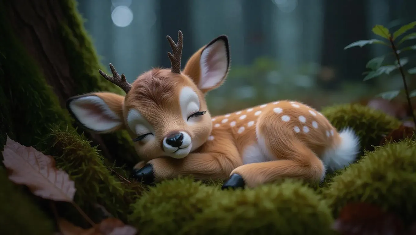 A fluffy, Jellycat-style little fawn lies nestled in a soft patch of moss in a misty woodlands. Its large, dreamy eyes are shut, and its soft, golden-brown fur glistens in the soft twilight. The fawn's tiny ears are perked up, adding to its adorable charm. The woodland surrounding it is veiled in fog, creating a mysterious and enchanting atmosphere. The scene is rendered in a cool, muted color palette, enhancing the overall cuteness and innocence of the fawn.