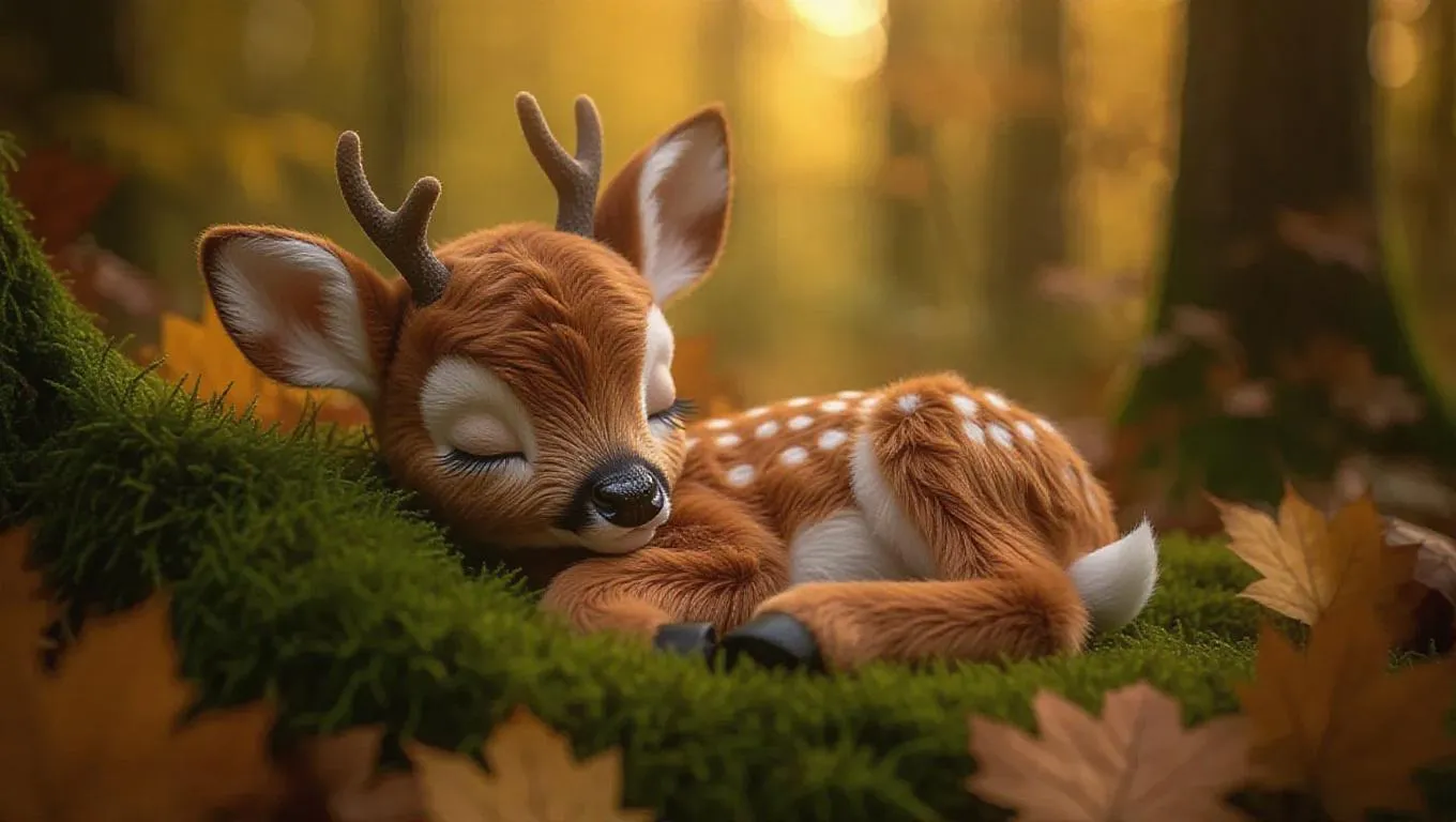 A fluffy, Jellycat-style little fawn rests curled up in a soft patch of moss in a vibrant autumn forest. Its large, watchful eyes are slowly closing, and its soft, russet-colored fur glistens in the soft fall light. The fawn's budding antlers are beginning to show, adding to its delightful appeal. The forest surrounding it is filled with warm autumn colors, creating a cozy and inviting atmosphere. The scene is rendered in rich, earthy tones, enhancing the overall cuteness and innocence of the fawn.