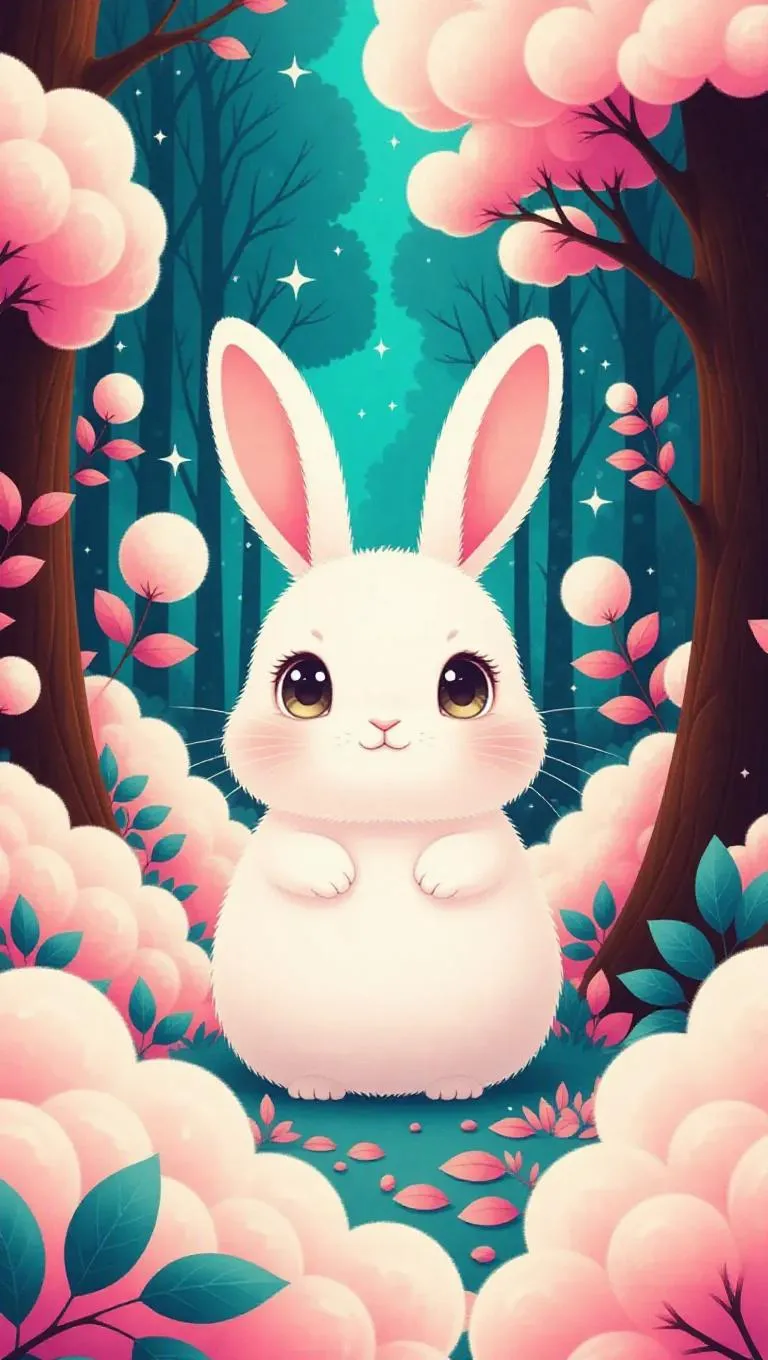 A soft, oversized rabbit with sparkling eyes and a gentle smile, surrounded by a cloud of cotton-candy-like fluff, creating a dreamy, whimsical atmosphere. The scene is set in a magical forest with fluffy, oversized trees and cotton-candy-like leaves. The style is influenced by traditional Japanese woodblock prints, with bold outlines and flat areas of color.