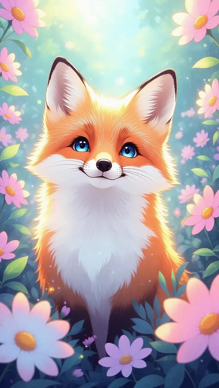 A soft, oversized fox with sparkling eyes and a joyful smile, surrounded by a cloud of magical, fluffy fluff, creating a vibrant, whimsical atmosphere. The scene is set in a mystical meadow with oversized flowers and sparkling, fluffy petals. The style is influenced by traditional Japanese woodblock prints, with delicate brush strokes and pastel colors.