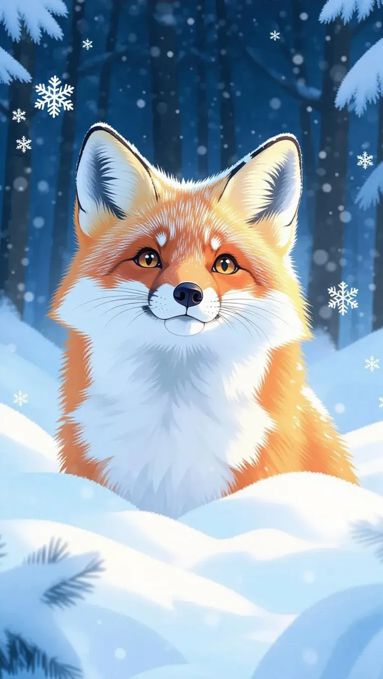 A soft, oversized fox with sparkling eyes and a gentle smile, surrounded by a cloud of snow-like, fluffy fluff, creating a tranquil, whimsical atmosphere. The scene is set in a winter wonderland with fluffy, oversized snowflakes and glistening, fluffy ice. The style is influenced by traditional Japanese woodblock prints, with soft outlines and cool color tones.
