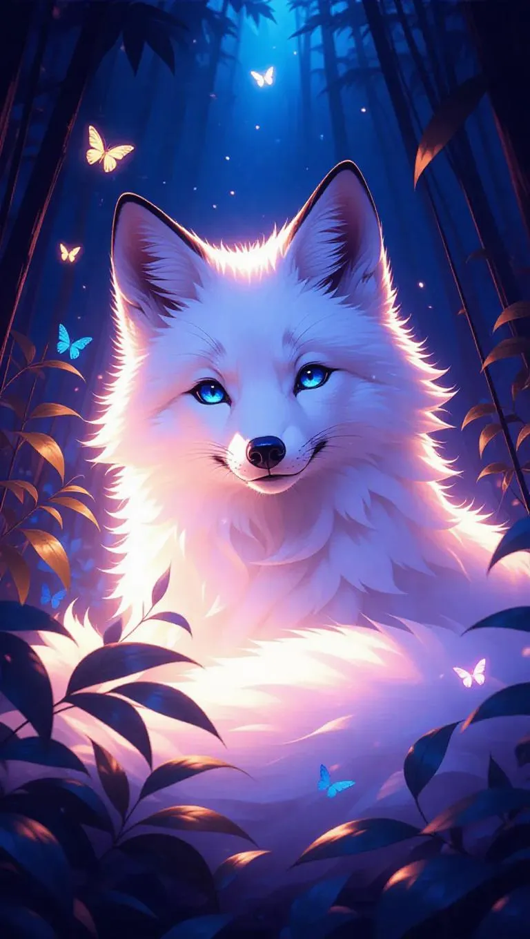 A soft, oversized fox with sparkling eyes and a gentle smile, surrounded by a cloud of shimmering, fluffy fluff, creating a magical, whimsical atmosphere. The scene is set in a twilight forest with oversized fireflies and sparkling, fluffy vines. The style is influenced by traditional Japanese woodblock prints, with shadow contrasts and rich hues.