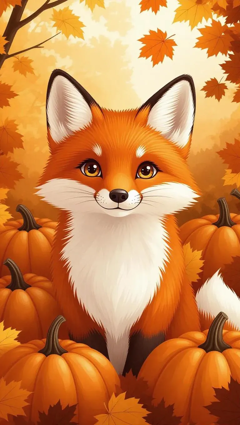 A soft, oversized fox with sparkling eyes and a gentle smile, surrounded by a cloud of autumn leaf-like, fluffy fluff, creating a cozy, whimsical atmosphere. The scene is set in a fall landscape with oversized pumpkins and golden, fluffy foliage. The style is influenced by traditional Japanese woodblock prints, with warm tones and textured patterns.