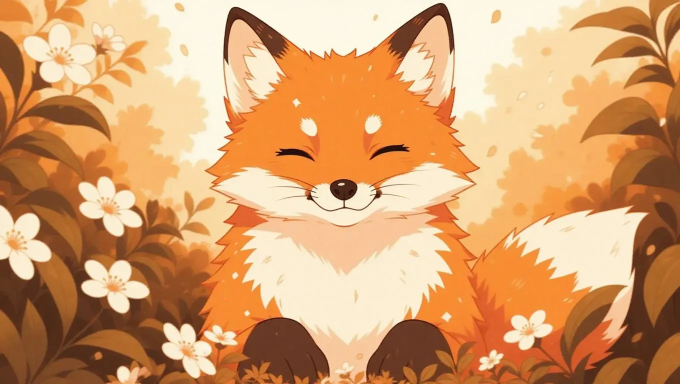 A soft, oversized fox with sparkling eyes and an inviting smile, surrounded by a cloud of soft, handspun fluff, creating a nurturing, whimsical atmosphere. The scene is set in a lush, oversized garden with babbling brooks and fragrant, fluffy blossoms. The style is influenced by traditional Japanese woodblock prints, with earth tones and gentle outlines.