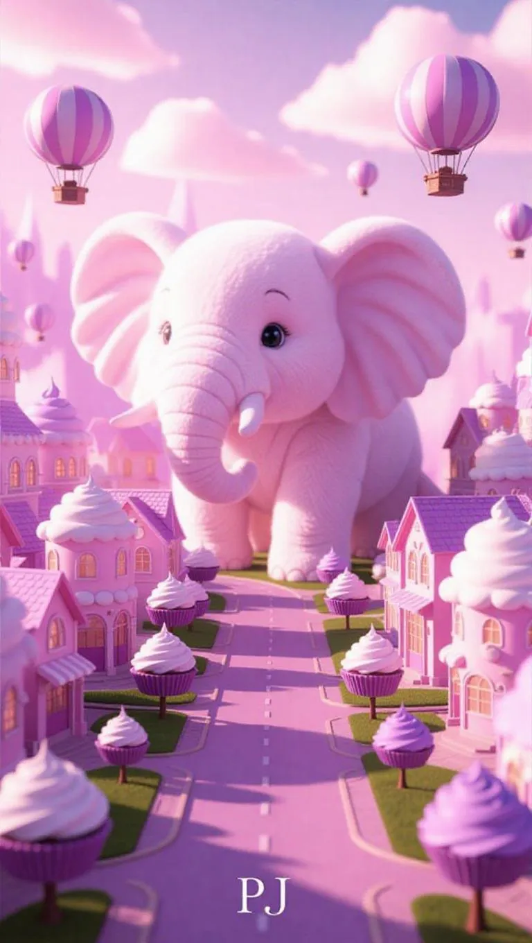 A pastel-colored cityscape viewed from above, where buildings and streets subtly form a fluffy, adorable elephant. The city features soft, billowy structures and rounded, bubble-like houses. Floating cupcake trees line the streets, and the roads are paved with frosting-like tiles. Warm lavender light casts a soft, magical haze, enhancing the whimsical and kawaii aesthetic. Airships shaped like cute owls gently float in the sky, contributing to the ultra-detailed, cinematic composition that balances realism and fantasy, evoking wonder and comfort. The style is reminiscent of a children's storybook illustration, with whimsical details and a playful tone.
