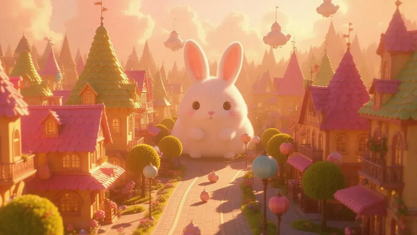 A pastel-colored cityscape viewed from above, where buildings and streets subtly form a fluffy, adorable rabbit. The city features soft, fluffy structures and rounded, bubble-like dwellings. Floating gumdrop trees line the streets, and the roads are paved with pudding-like tiles. Warm amber light casts a soft, magical haze, enhancing the whimsical and kawaii aesthetic. Airships shaped like furry squirrels gently float in the sky, contributing to the ultra-detailed, cinematic composition that balances realism and fantasy, evoking wonder and comfort. The style is reminiscent of a children's storybook illustration, with whimsical details and a playful tone.