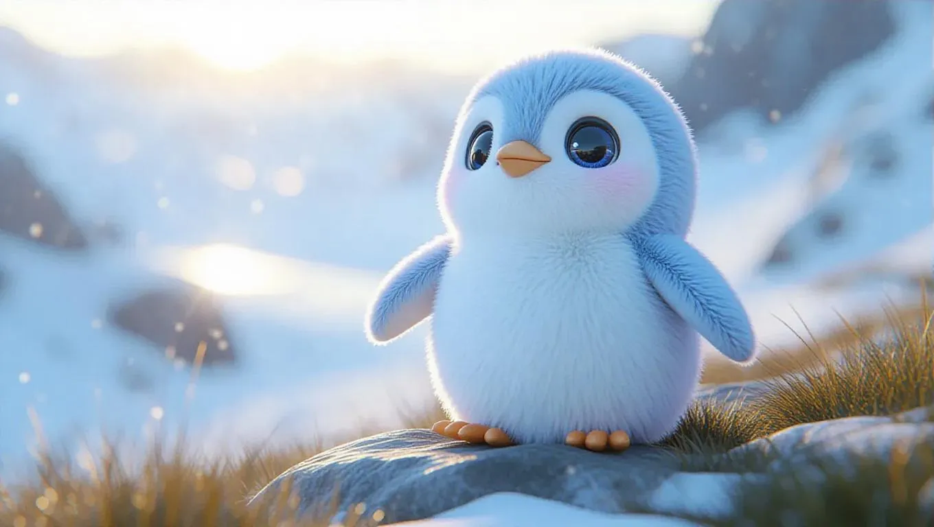A fluffy, Jellycat-style little penguin stands proudly on a hilltop, overlooking a vast, icy tundra. Its large, expressive eyes are wide with wonder, and its soft, pastel blue feathers glisten in the shimmering sunlight. The penguin's tiny flippers are spread, adding to its endearing charm. The tundra around it is bathed in warm, white light, creating a cozy and inviting atmosphere. The scene is rendered in a soft, pastel color palette, enhancing the overall cuteness and innocence of the penguin.