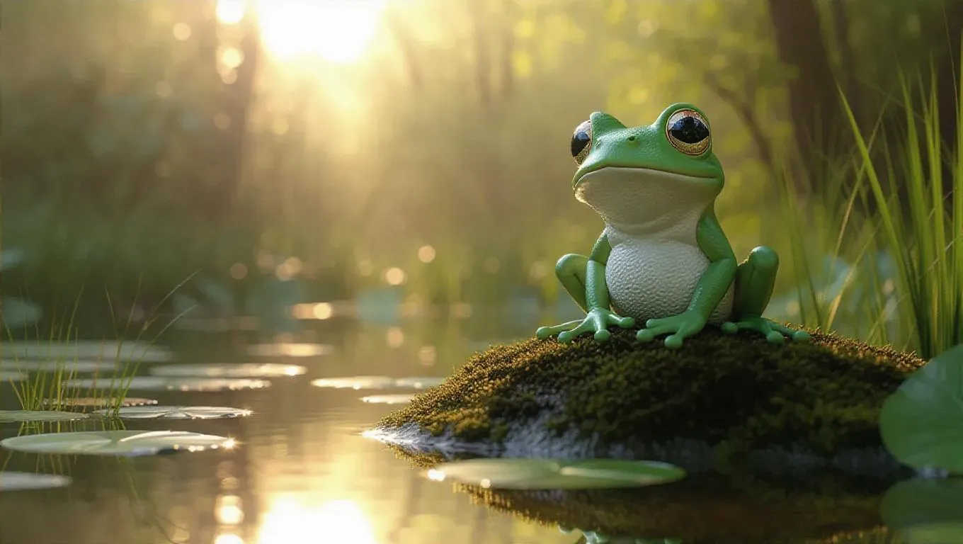 A fluffy, Jellycat-style little frog stands proudly on a hilltop, overlooking a vast, serene pond. Its large, expressive eyes are wide with wonder, and its soft, pastel green skin glistens in the dappled sunlight. The frog's tiny legs are playfully stretched, adding to its endearing charm. The pond around it is bathed in warm, tranquil light, creating a cozy and inviting atmosphere. The scene is rendered in a soft, pastel color palette, enhancing the overall cuteness and innocence of the frog.